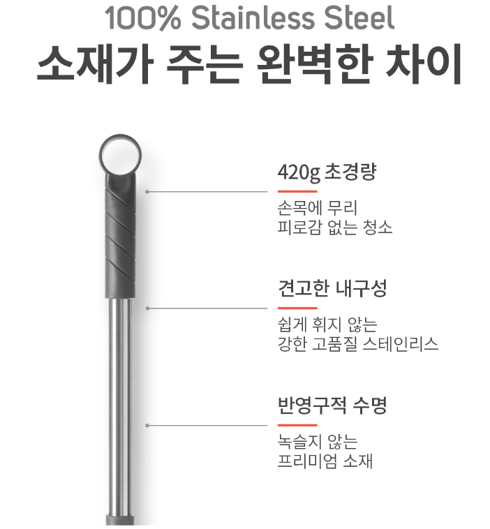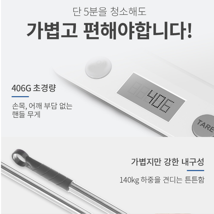 손목, 어깨 부담없는 핸들 무게로 140kg 하중을 견디는 튼튼한 소재로 구성된1.6M 길이 내 키에 적합한 길이 조절을 할 수 있습니다.