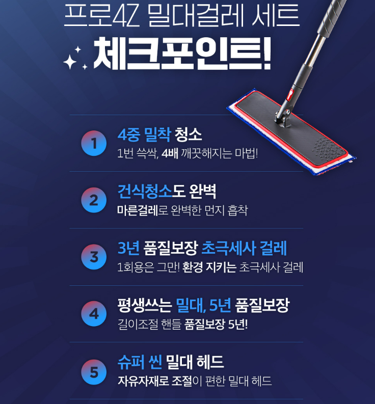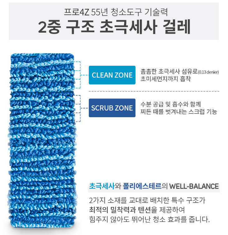 수분을 충분히 머금어 지든 때를 불려주는 폴리에스터 소재로써 먼지를 흡착하는 초극세사 소재를 교차 편직하여 청소 효과를 극대화 해줍니다.
