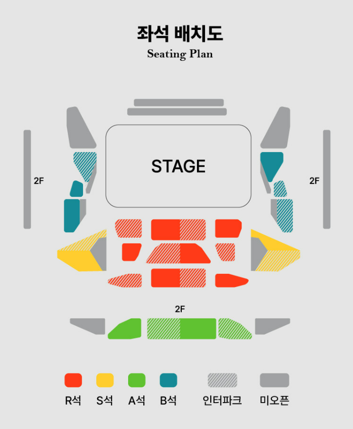 ※ 1층 C구역 17열 / 2층 A, B, C, D, E구역 1열 / 2층 L,R구역은 관객의 안전을 위해 좌석 앞에 안전바가 설치되어 무대 일부를 가릴 수 있는 좌석이니 예매 시 참고를 부탁드립니다.